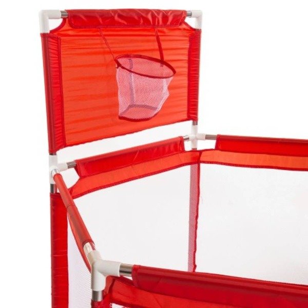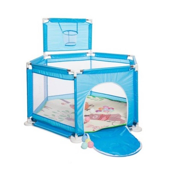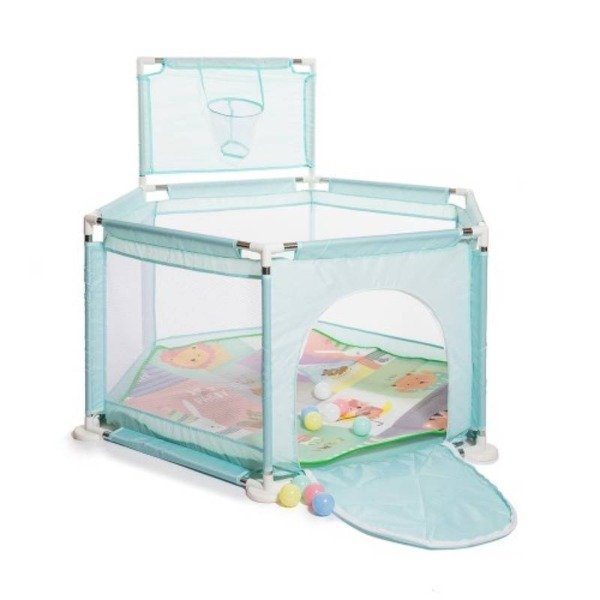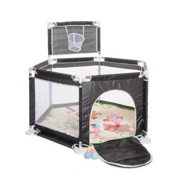 • Con pelotas, aro de básquet y una alfombra con diseños.